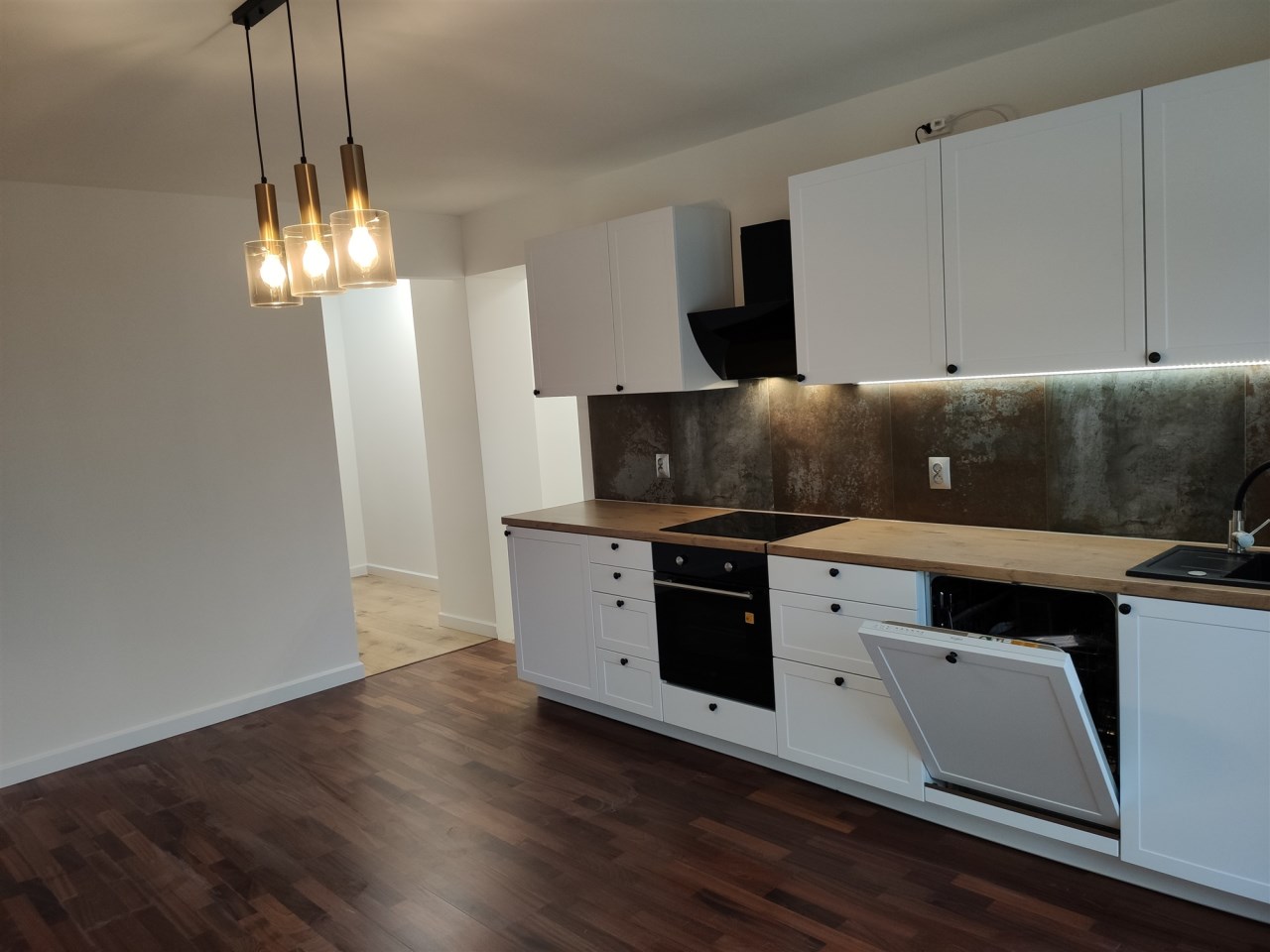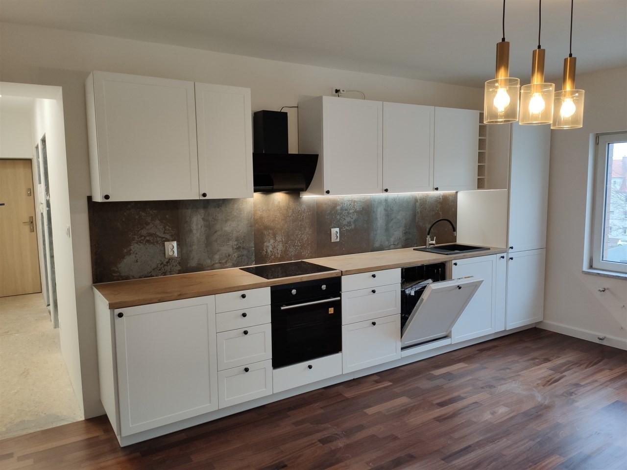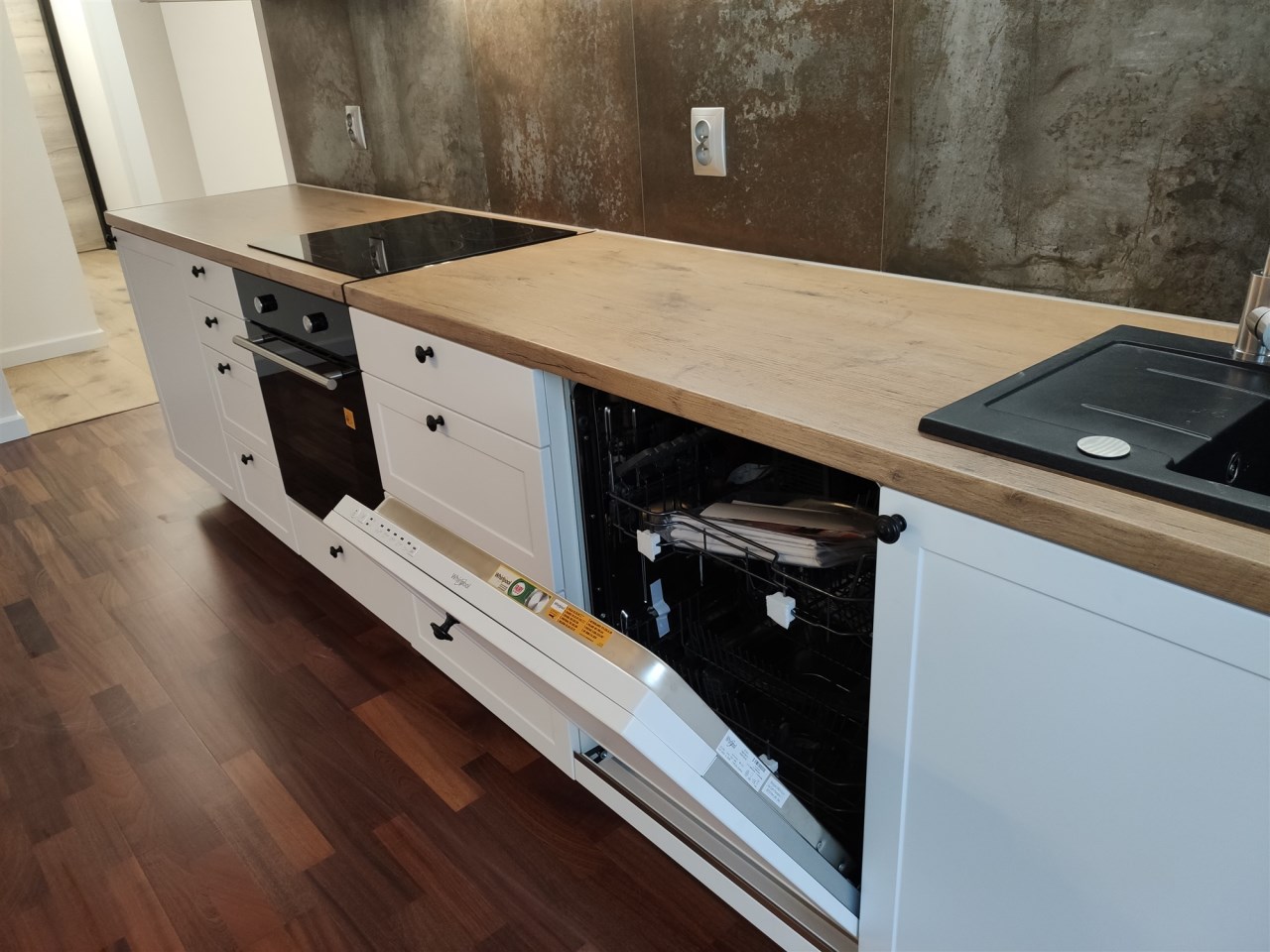 Kuchnia w zabudowie z nowym sprzętem AGD.