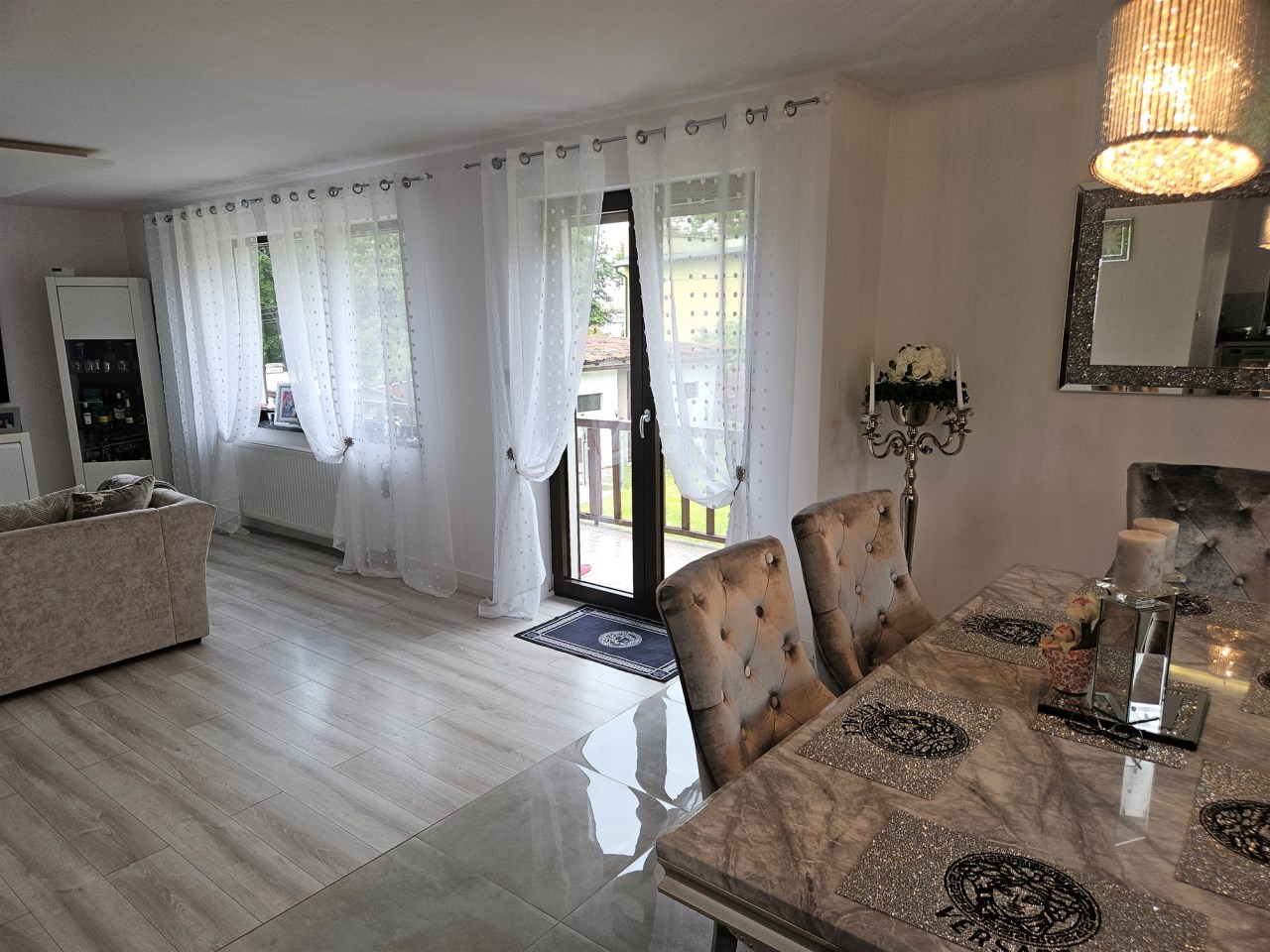 Przestronny salon z wyjściem na taras i ogród