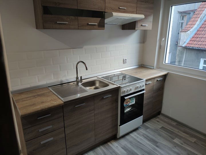Kuchnia wyposażona w meble kuchenne, okap i kuchenkę elektryczną.